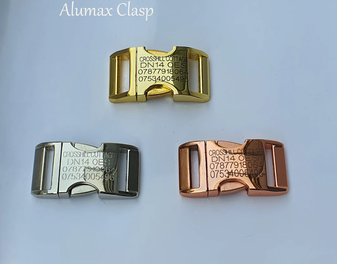 - The Alumax Steel Clasp is available as 20mm or 25mm width option- and can be engraved upto 3 lines- see photo. Please bear in mind with the 3 lines of engraving and the size of the Clasp, text info cannot be too long.