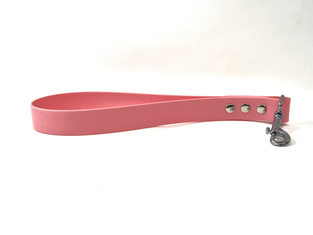 Both colourful and practical our range of PVC /TPU coated waterproof Traffic Handles are practical, hard-wearing and stylish. Our traffic handles are 35cm long (including clasp) and come in either 20mm or 25mm widths. They come in a choice of Brass, Stainless Steel, Rose Gold or Black snap hooks that can be fastened to any collar.