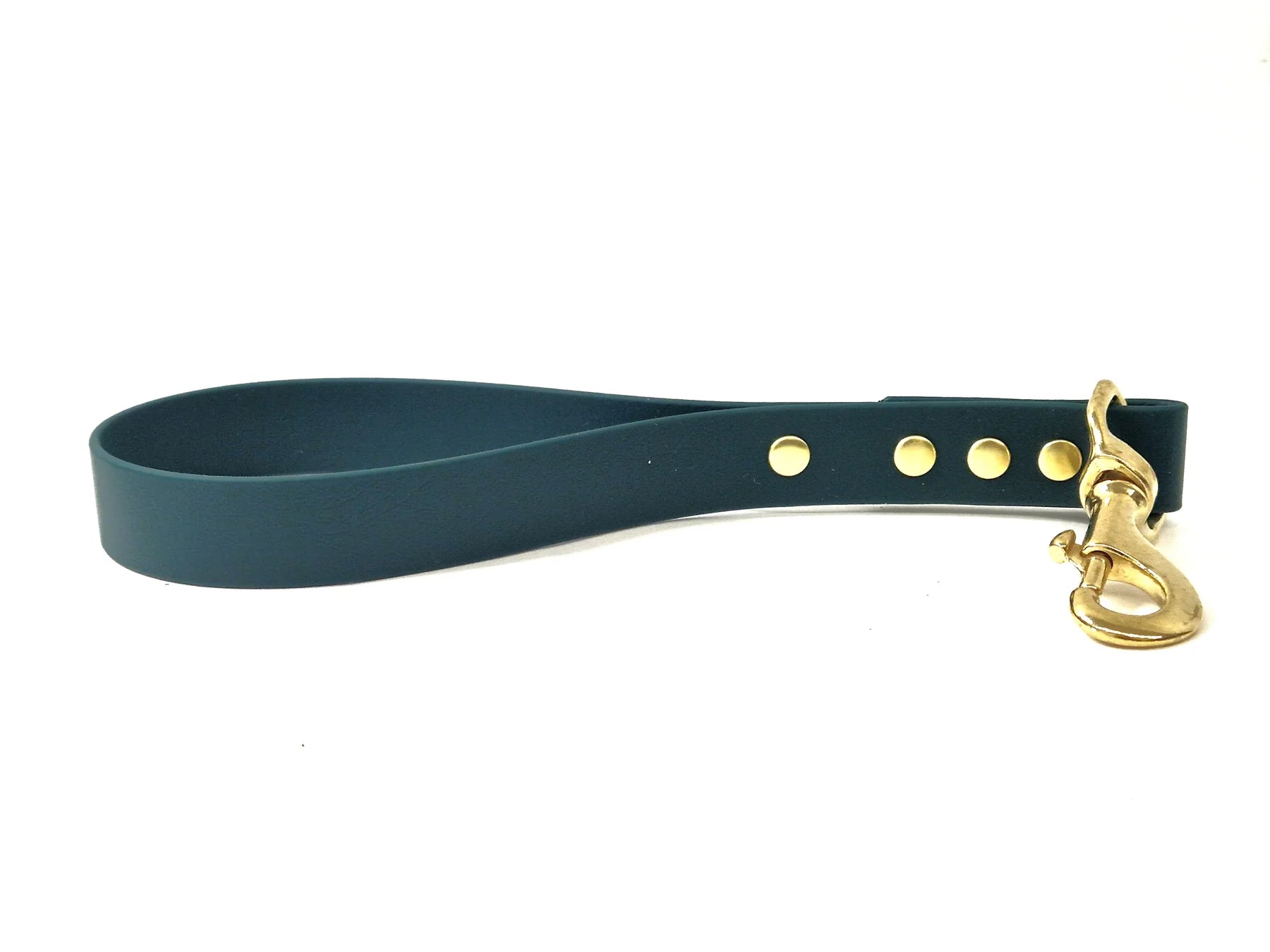 Both colourful and practical our range of PVC /TPU coated waterproof Traffic Handles are practical, hard-wearing and stylish. Our traffic handles are 35cm long (including clasp) and come in either 20mm or 25mm widths. They come in a choice of Brass, Stainless Steel, Rose Gold or Black snap hooks that can be fastened to any collar.