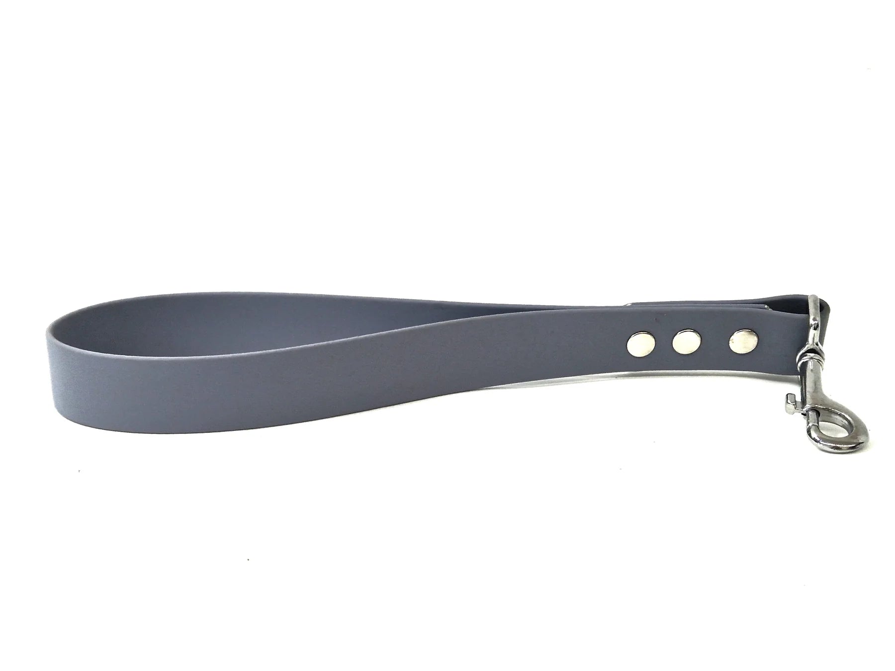 Both colourful and practical our range of PVC /TPU coated waterproof Traffic Handles are practical, hard-wearing and stylish. Our traffic handles are 35cm long (including clasp) and come in either 20mm or 25mm widths. They come in a choice of Brass, Stainless Steel, Rose Gold or Black snap hooks that can be fastened to any collar.