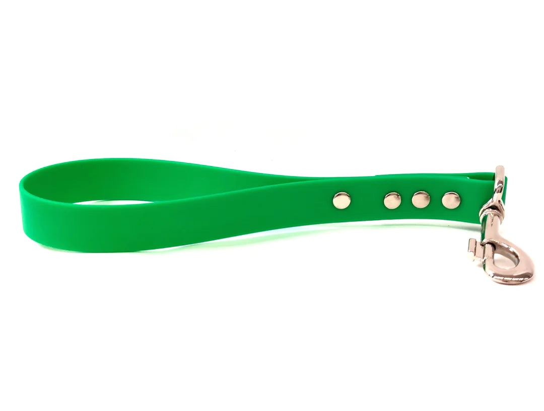 Both colourful and practical our range of PVC /TPU coated waterproof Traffic Handles are practical, hard-wearing and stylish. Our traffic handles are 35cm long (including clasp) and come in either 20mm or 25mm widths. They come in a choice of Brass, Stainless Steel, Rose Gold or Black snap hooks that can be fastened to any collar.