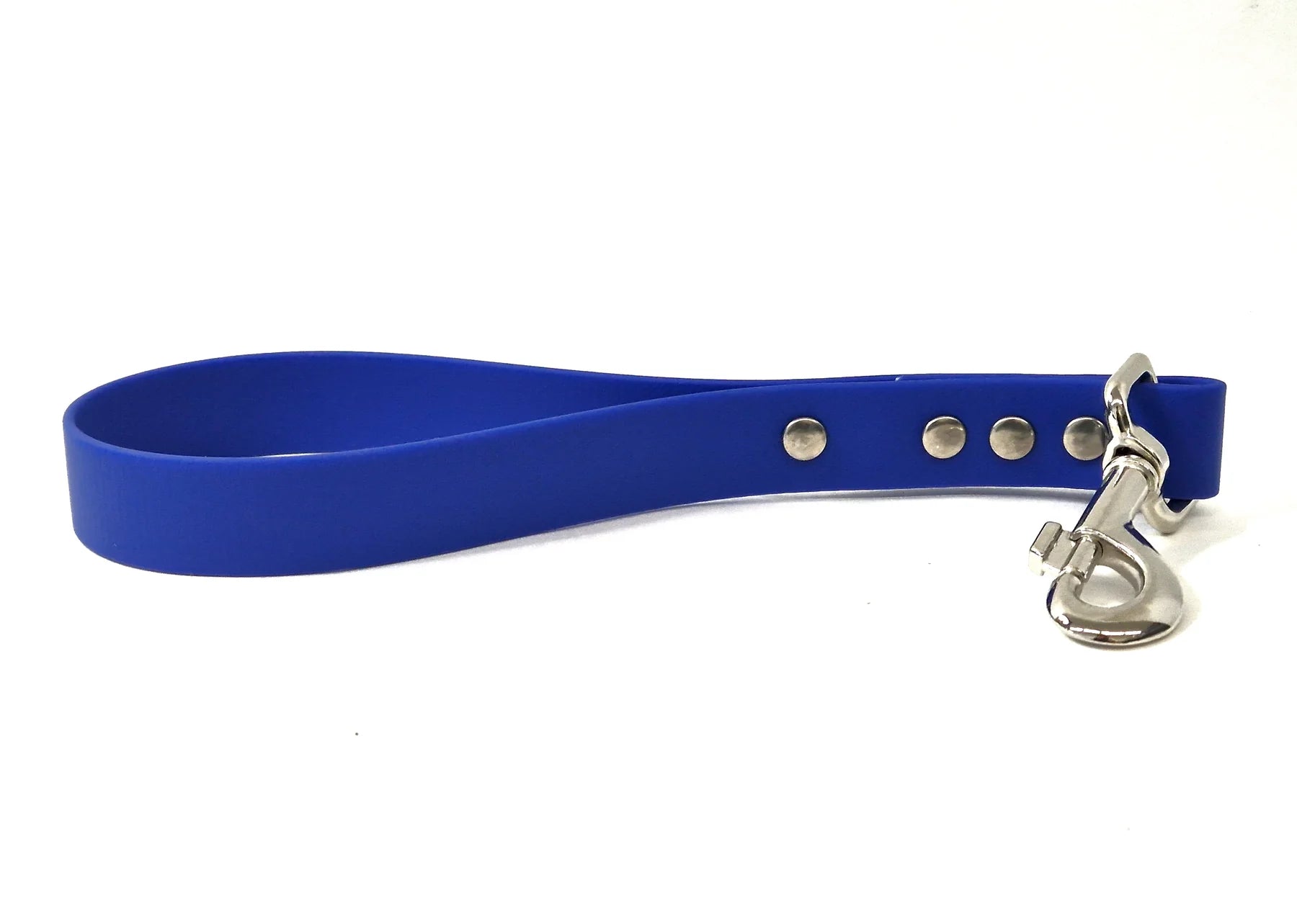 Both colourful and practical our range of PVC /TPU coated waterproof Traffic Handles are practical, hard-wearing and stylish. Our traffic handles are 35cm long (including clasp) and come in either 20mm or 25mm widths. They come in a choice of Brass, Stainless Steel, Rose Gold or Black snap hooks that can be fastened to any collar.