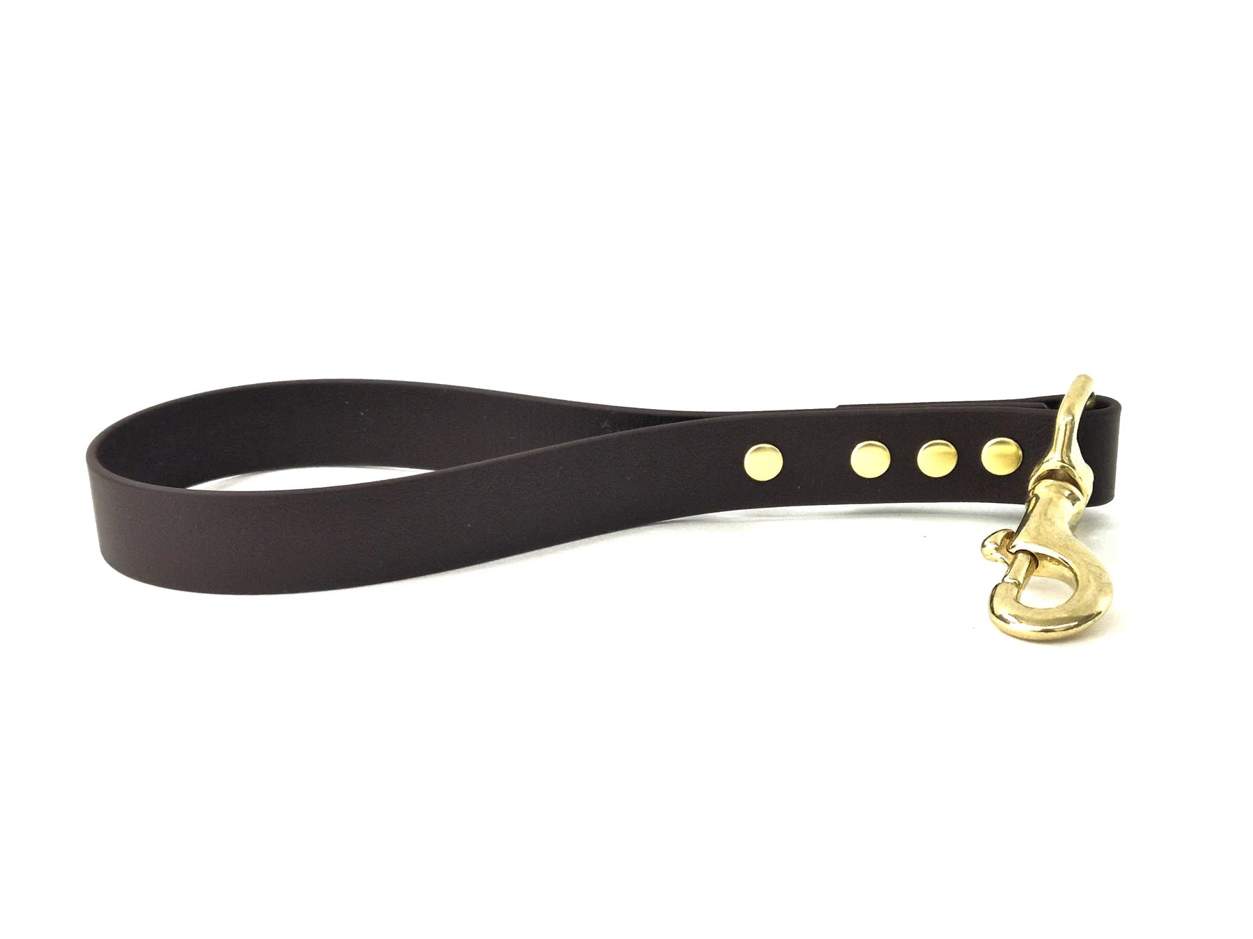 Both colourful and practical our range of PVC /TPU coated waterproof Traffic Handles are practical, hard-wearing and stylish. Our traffic handles are 35cm long (including clasp) and come in either 20mm or 25mm widths. They come in a choice of Brass, Stainless Steel, Rose Gold or Black snap hooks that can be fastened to any collar.