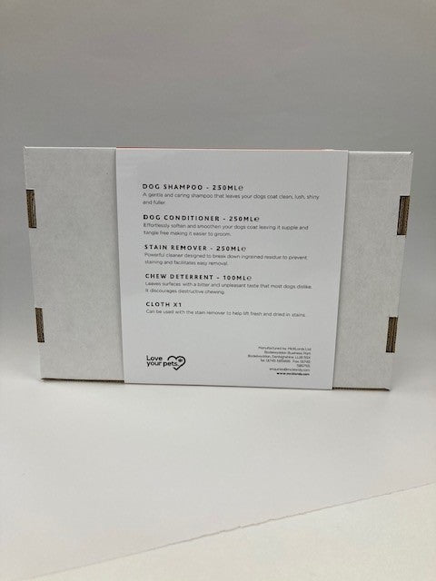 The perfect care kit for your dog. Includes dog shampoo, dog conditioner, stain remover, chew deterrent and a cleaning cloth. All products come packed in a kit, containing everything you need to care for your dog.
